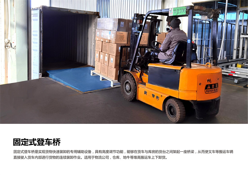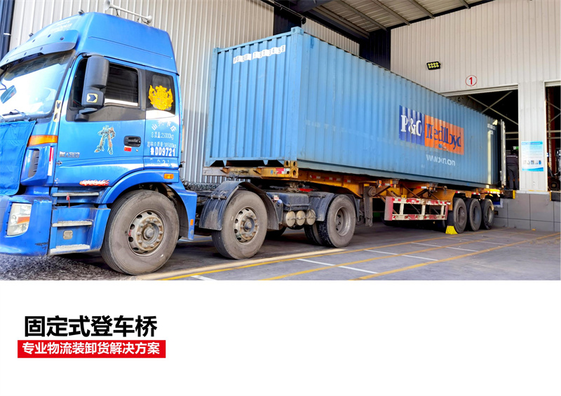 適用場所:產品可根據用戶的不同需要,廣泛應用于碼頭、站臺、倉庫等地。在外形尺寸,承受載荷等方面都可以作特殊設計。固定式登車橋安裝在貨臺的側面,與貨臺地面和側面齊平。固定式登車橋的橋板可上、下傾斜,其外端可高出或低于貨臺平面,使之與車廂等高。橋板的頂端有一翻板,自動搭在車廂邊緣,使貨臺與車廂平穩過渡。