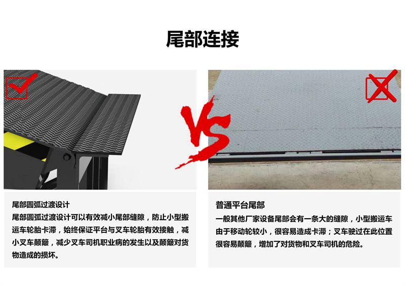 調節板兩側分別有3塊活動板,可有效避免調節板下降時壓傷腳趾的危險,以確保安全。固定式登車橋調節板底座前面為開放式設計,清理雜物方便快捷。
