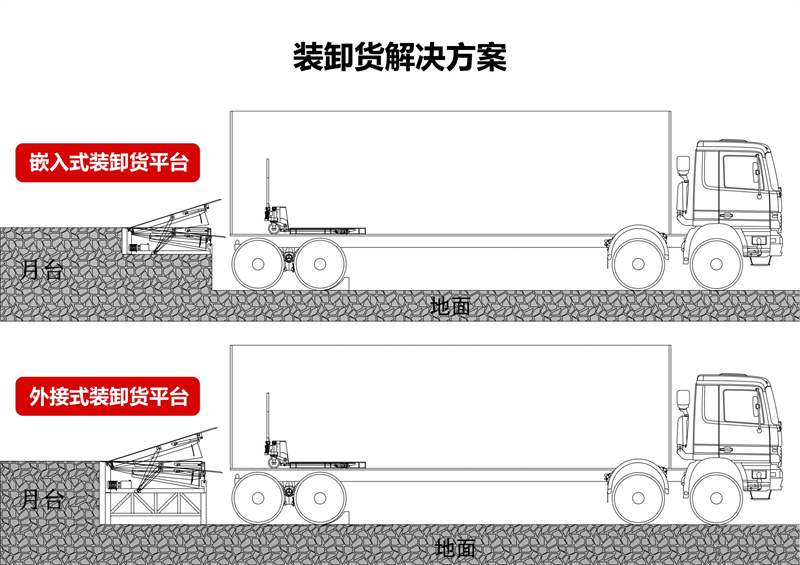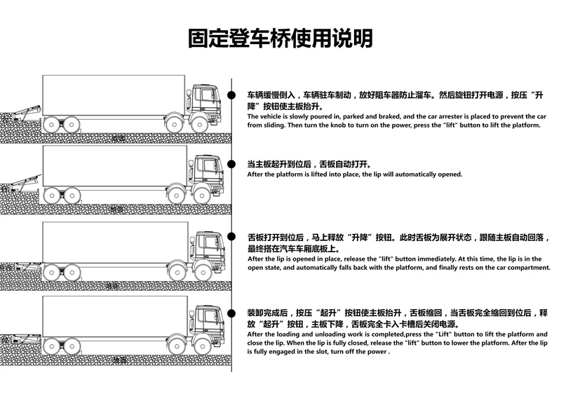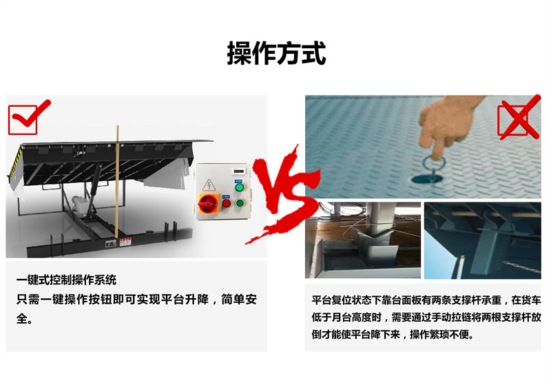 電控操作只需按動按鈕,調節板會自動升起,操作極其簡單;松開按鈕,調節板靠自重下降, 活頁搭板搭在貨車上即可使用。