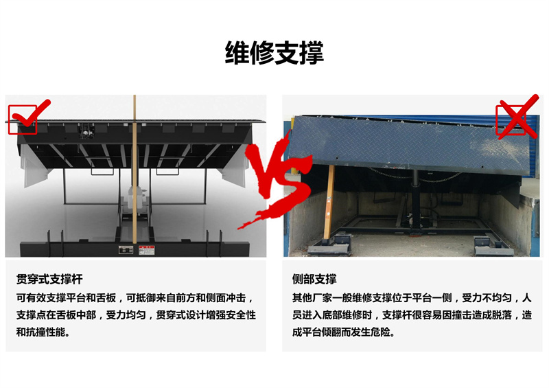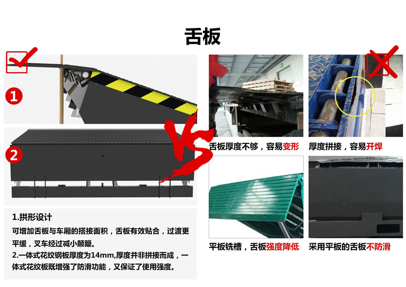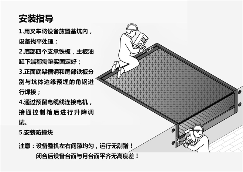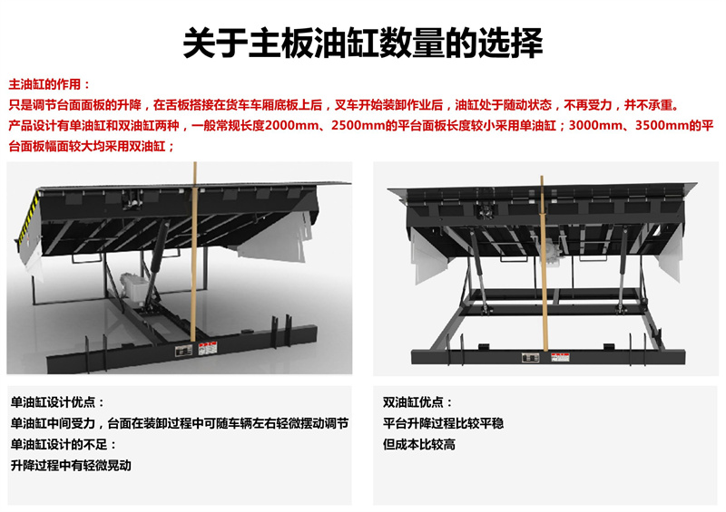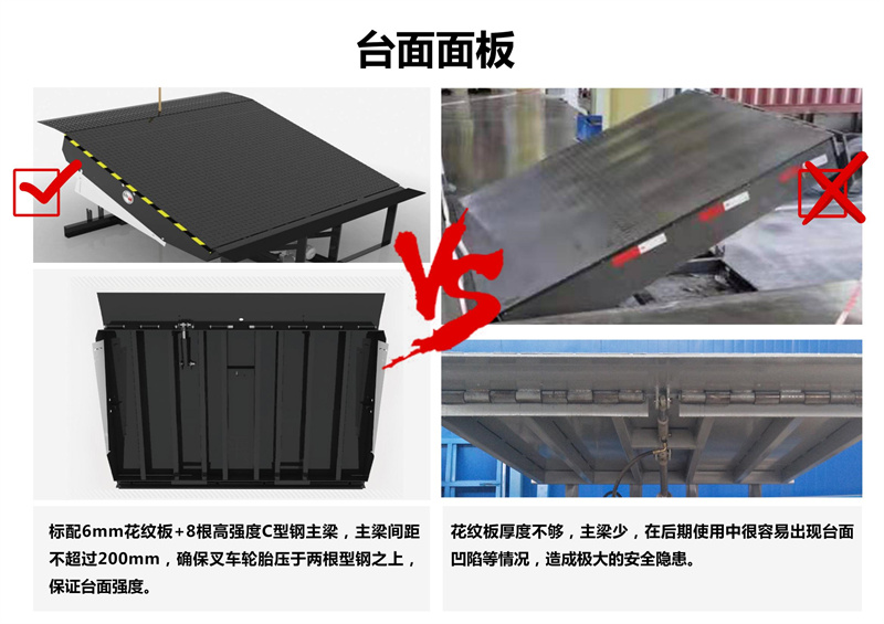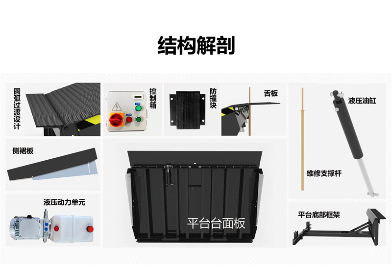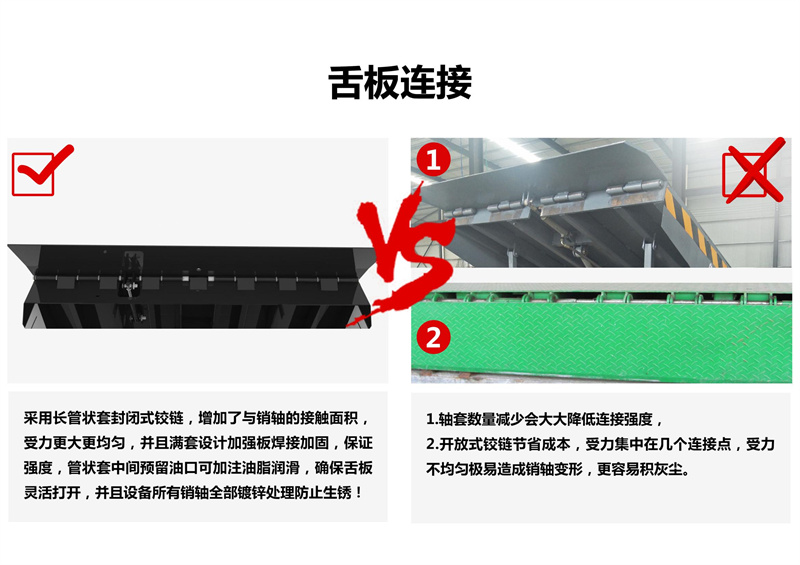 通過動力系統,大油缸升起整個斜板,至頂位時,小油缸開始工作,順暢伸出活頁搭板, 高度調節板全部采用濟南濟鋼優質高度花紋鋼板及型材緊密焊接,壽命長久。