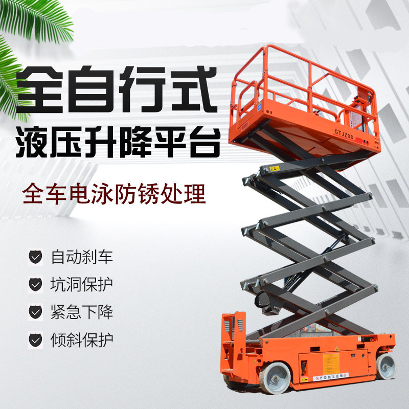 自行式升降平臺是一種多功能起重裝卸機械設備。起升高度從1米至20米不等,可根據個人要求訂做特殊規格的平臺。自行式升降平臺一般采用高強度合金材質,結構堅固,使升降機的偏轉與擺動極小。具有自動行走功能,可選三項電源控制和電瓶控制行走,能夠在不同工作狀態下,不需外接電源,手柄控制行走,速度可調式,移動靈活、操作方便、升降自如,只需一人便可完成前進、后退、轉向、快、慢速行走和上下等動作,省工、省力。特別適用于車站、碼頭、機場、電廠、體育場館、大型企業等較大范圍的高空作業。