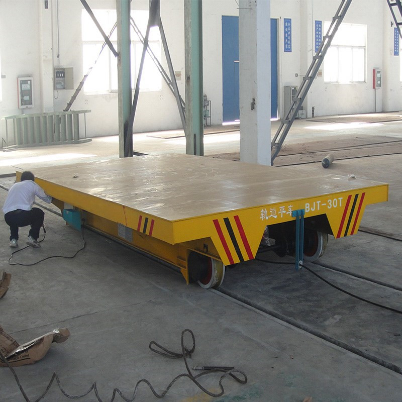 拖纜軌道行走平板車運行時時靠平車所拖地電纜供電。電纜的一端接在地面電源上,另一端經電動平車的鐵夾裝置引入平車。該型電動平車的特點是臺面高度較低,裝卸重物容易,但運行距離不能太長,一般不能超過100m,過長容易纏繞電纜。